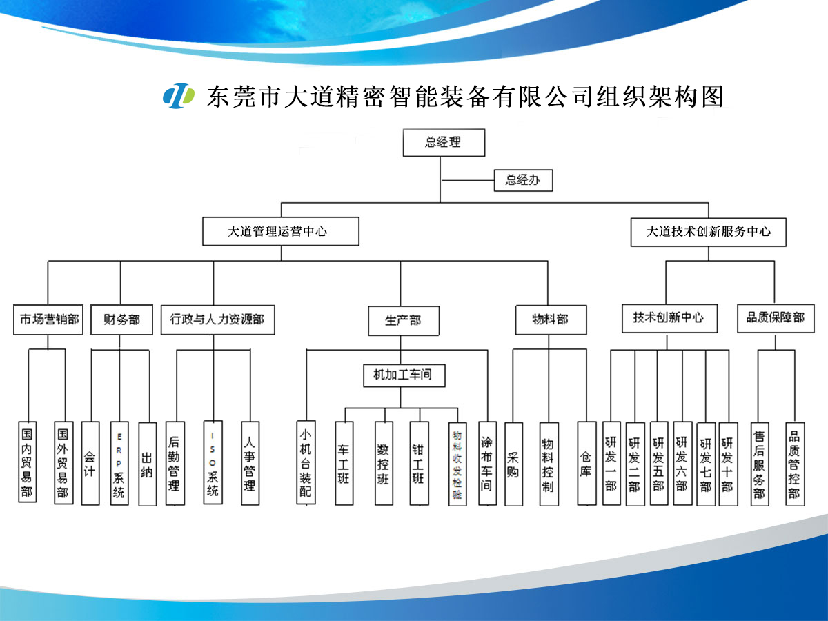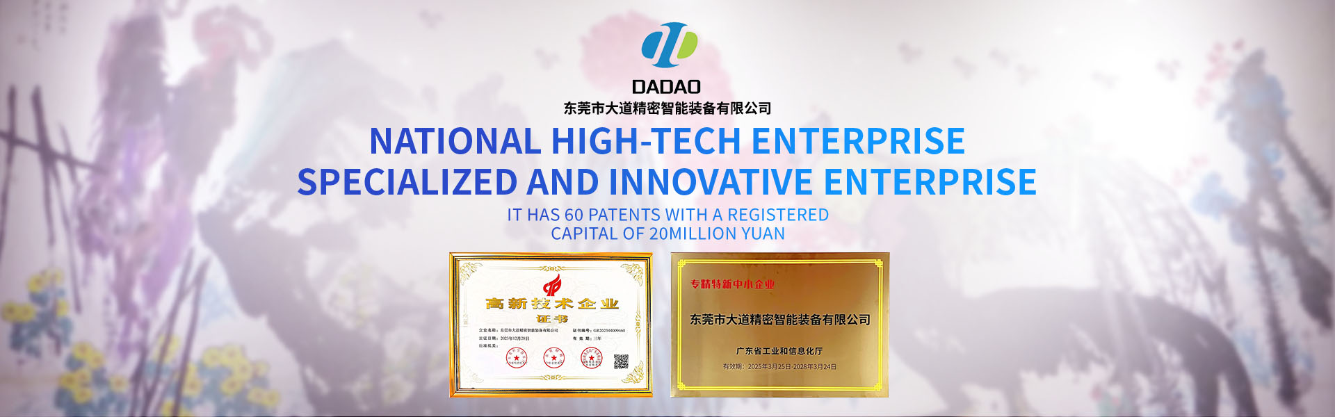 大道精密成立于2019年,公司注冊資本1000萬元,擁有辦公室、廠房等18,000多平方米。已通過ISO9001:2015國際質(zhì)量管理體系認(rèn)證,擁有國家各類專利共計(jì)58項(xiàng),獲得“中國大道.商標(biāo)”和“一帶一路十周年 .國禮品牌”等榮譽(yù)稱號,屬于國家高新技術(shù)企業(yè),專精特新中小企業(yè)。2023年4月成立了“東莞市大道精密智能裝備有限公司關(guān)心下一代工作委員會”,是東莞市企石鎮(zhèn)工商聯(lián)副會長單位、東莞市企石鎮(zhèn)文學(xué)藝術(shù)界聯(lián)合會副主席單位、東莞市環(huán)保包裝行業(yè)協(xié)會副會長單位、東莞市數(shù)控裝備行業(yè)協(xié)會第二屆會長單位、廣東省包裝技術(shù)協(xié)會常務(wù)理事單位、廣東省膠粘劑行業(yè)協(xié)會理事單位、國家標(biāo)準(zhǔn)《機(jī)械安全中安全防護(hù)授權(quán)系統(tǒng)的基本要求》起草單位。